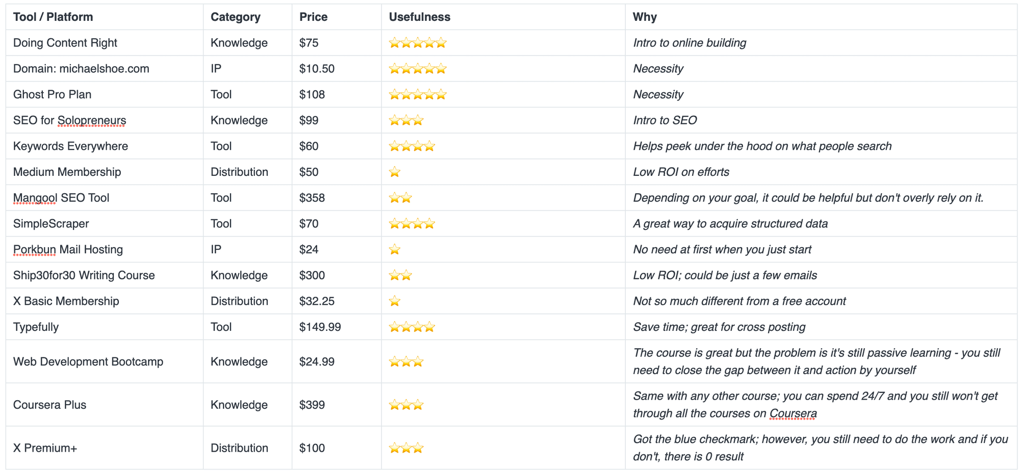 Last year, I cast a wide net. I paid for memberships I didn’t use and tools I didn’t need. This year, my goal was to run leaner and smarter. I wanted every dollar leaving my bank account to directly contribute to two things: infrastructure(keeping the lights on) or growth (getting eyes on the projects).