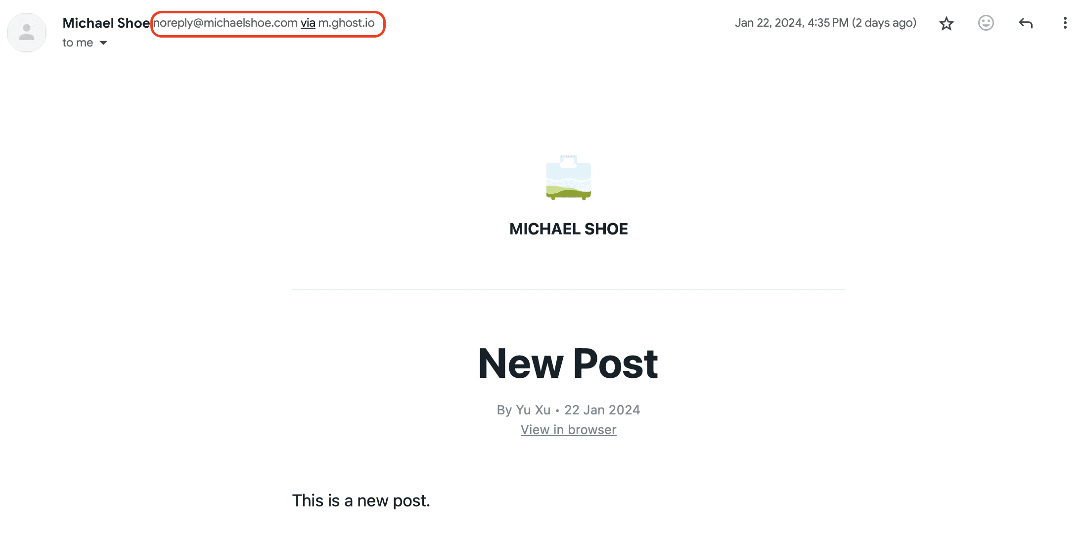 This is my first newsletter sent to myself with Ghost. The email was sent from noreply@michaelshoe.com via m.ghost.io. The only thing I did before this was linking my own domain with Ghost, and magically, I am capable of sending out email newsletters in bulk to my subscribers (though I still don’t know the mechanism behind)!