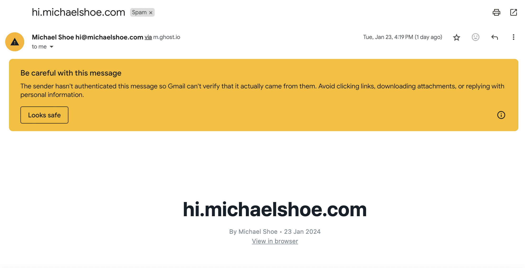 I changed all email addresses to my own hi@michaelshoe.com, both for the Membership Portal and for the Newsletter, and then gave it a shot. Something horrible happened afterwards: all my email newsletters and signup welcome emails went straight into spam; when I dug them out of the graveyard, they were covered with a warning sign like this: