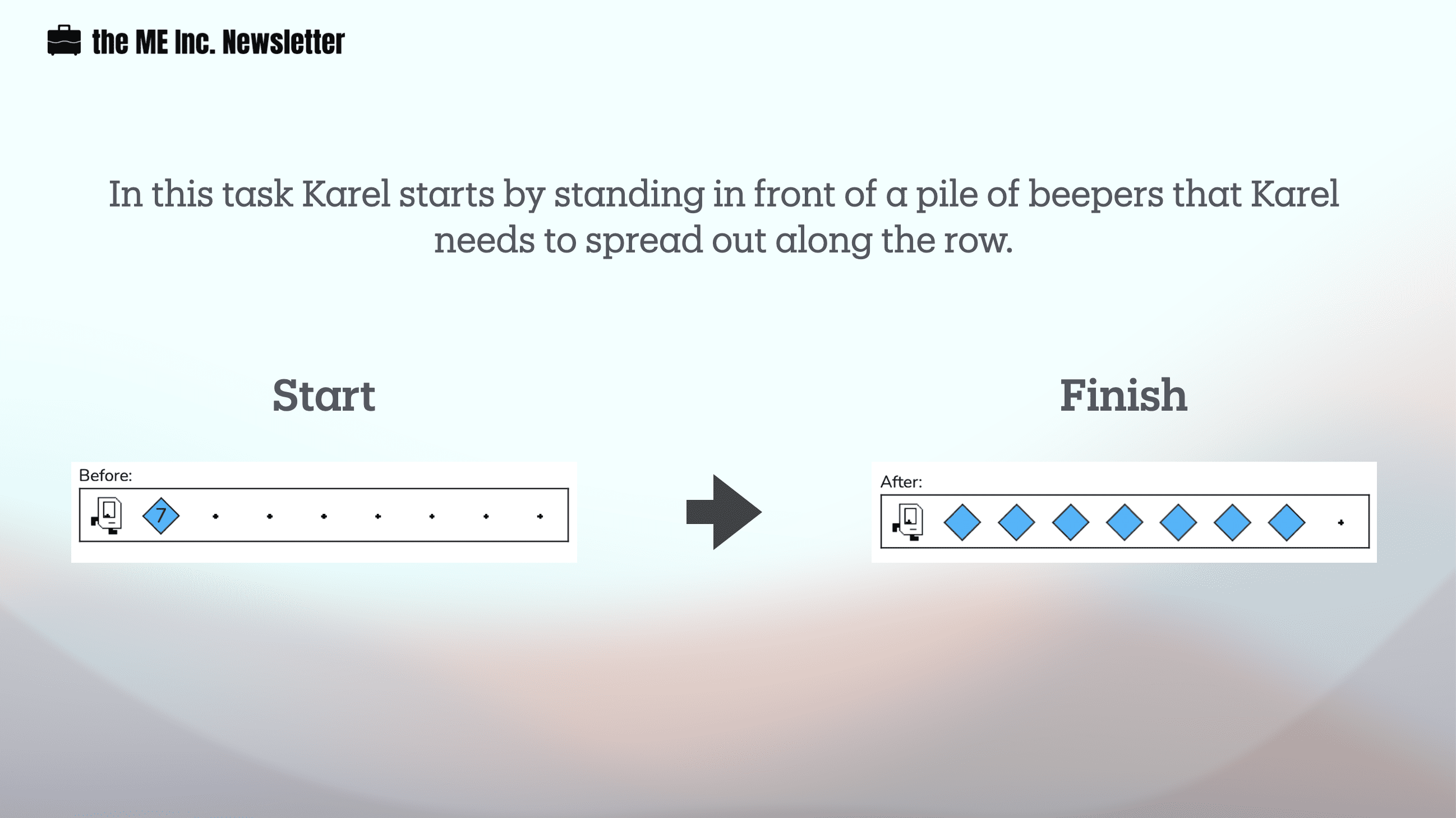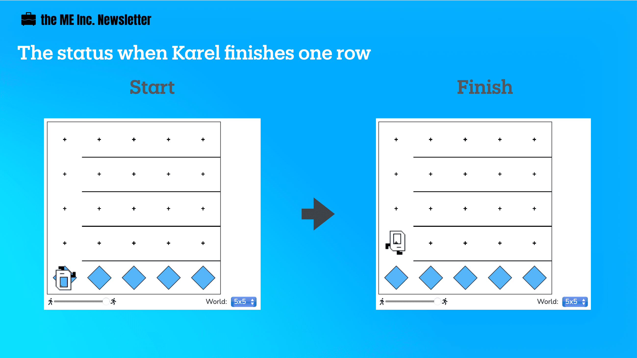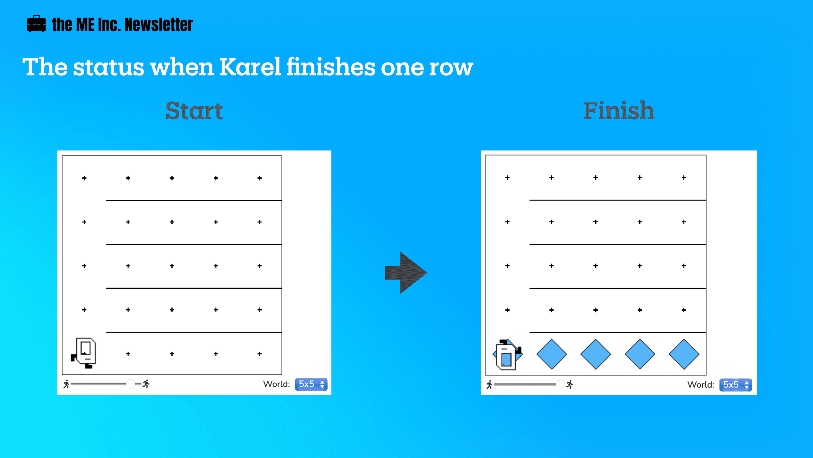 At this point, Karel will be, again, facing an empty row, ready to lay down the beepers for that row, so it’s just a matter of repeating the same process.