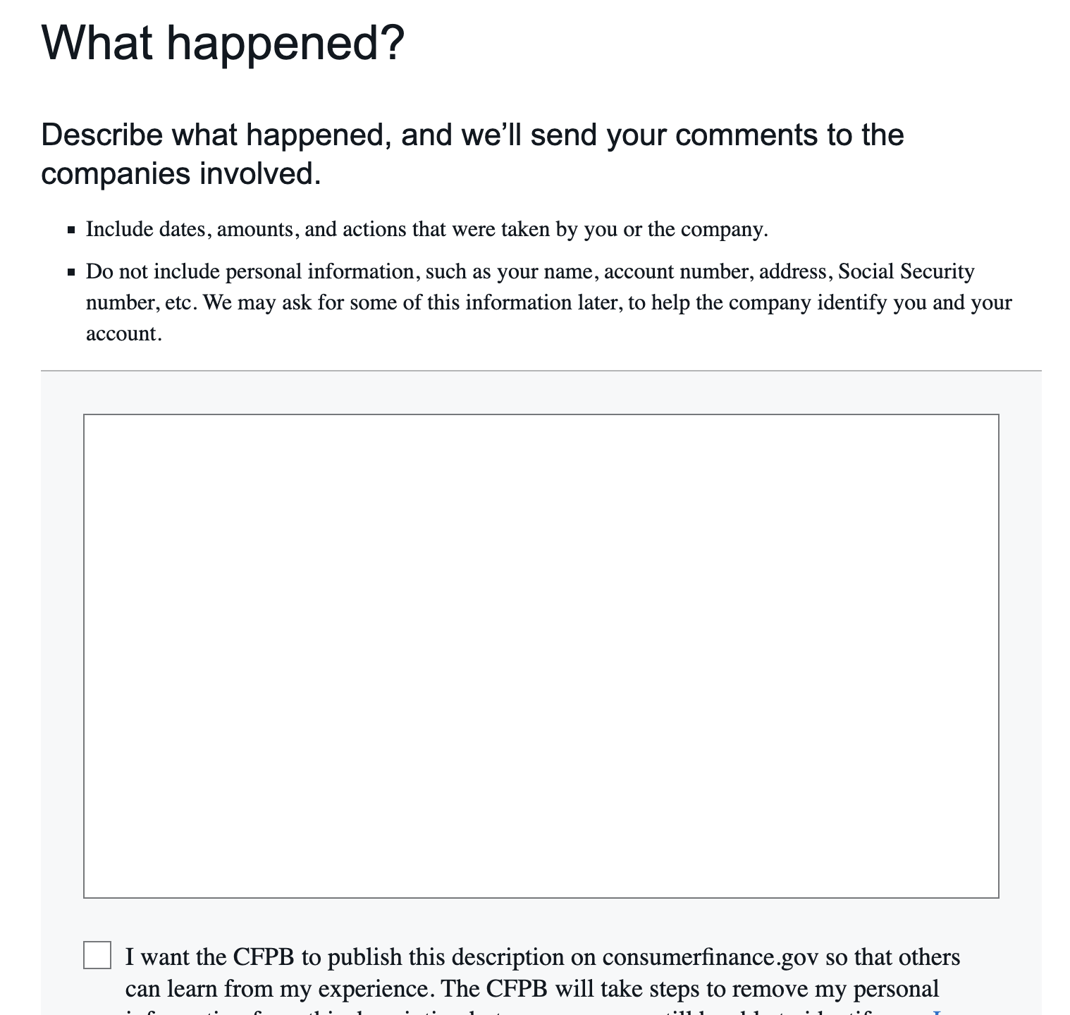 First, describe what happened, and CFPB will send your comments to the companies involved.